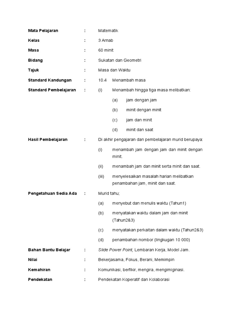 Mengira tempoh masa dalam sebarang unit masa. Maklumat yang perlu dicatatkan dalam RPH adalah hari dan tarikh mata pelajaran dan kelas masa tajuk dan objektif. Tunjuk muka jam dan perkenalkan jarum jam dan minit.